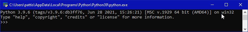 A pop-up window with the title C:\Users\Pattis\AppData\Local\Programs\Python\Python39\python.exe appears, and inside the window; on the first line is the text Python 3.9.6 … (notice that it should also say 64 bit). Inside the window, at the bottom left, is the prompt >>>: type exit() to this prompt and press enter to terminate Python.