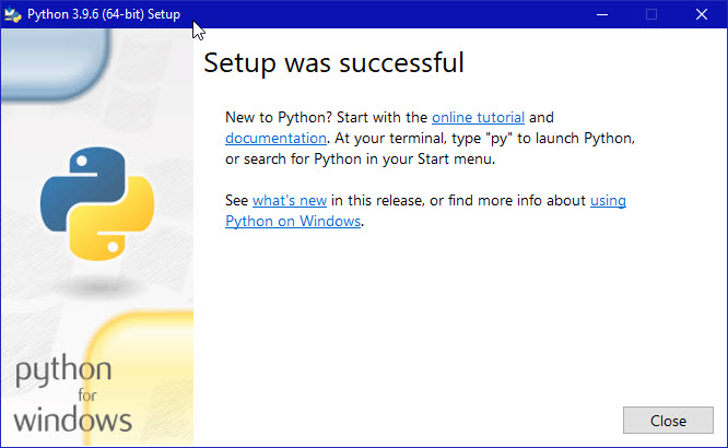 During installation, it will show the various components it is installing and move the progress bar towards completion. Soon, a new Python 3.9.6 (64-bit) Setup pop-up window will appear with a Setup was successfuly message.