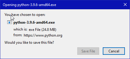 2.Click the Download Python 3.9.6 button. The following pop-up window titled Opening python-3.96-amd64.exe will appear.